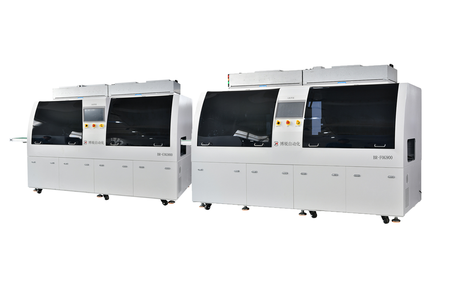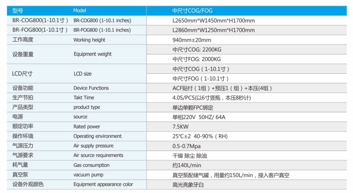 - 机器功能: 全自动COG(Chip on glass)邦定机,满足LCD单边单颗IC实装从ACF贴付、IC预压、IC伺服本压工艺全制程。整机LCD采用视觉校正,机械手采用直线马达搬运设计,本压铸铁骨架,本压缓冲材(铁氟龙)是前放后收结构,充分利用辅材,左右为皮带线进出料,IC盒由人工放置于上料托盘上由机械手自动拾取上料,可自动完成IC的邦定。 全自动FOG邦定机具备单边单段FPC邦定的能力,整机采用1+1+4模式,即1个贴付工位、1个预压工位、4个本压工位。LCD采用视觉校正,机械 手采用直线马达